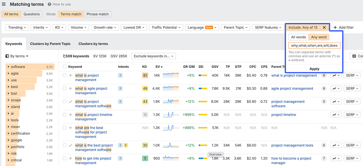 If your site is new, doesn’t get much search traffic yet, or you’re simply researching another industry, you can also use the same terms in a filter of Ahrefs’ Keywords Explorer tool.