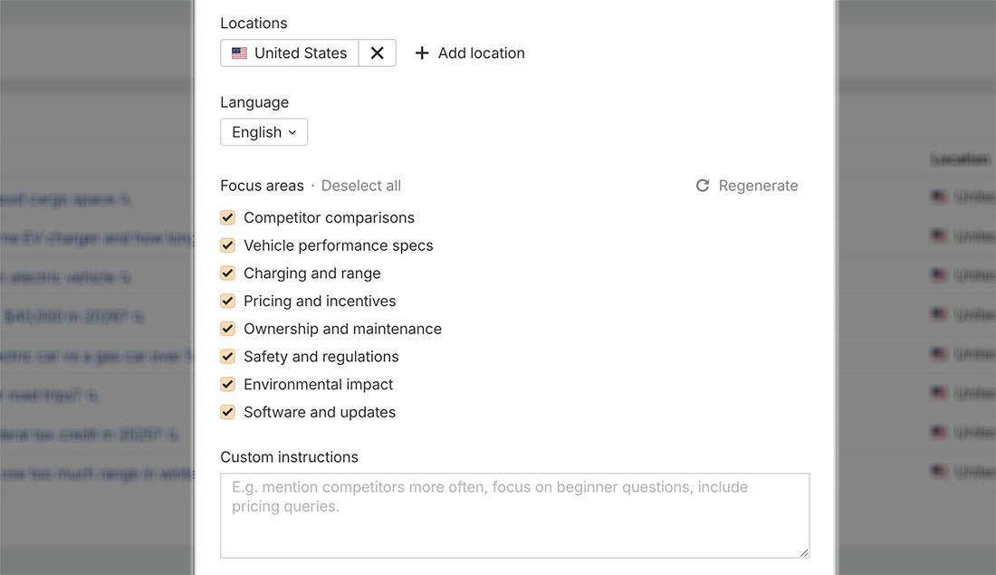 If you already know what you want to track, custom prompt functionality in Brand Radar allows you to monitor responses across the locations and platforms of your choice, on a daily, weekly, or monthly schedule.