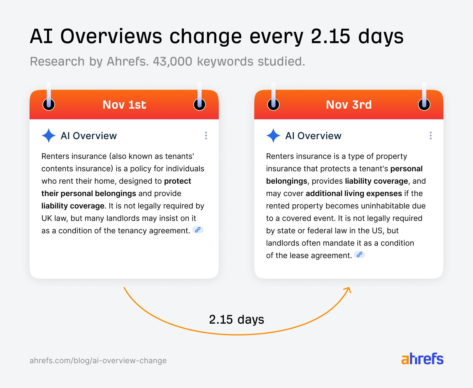 Again, the real blow came when AI Overviews almost doubled overnight. According to a recent Ahrefs’ study, these now change every two days in terms of the text generated, URLs cited, and brands mentioned. So expect your brand mentions and AI citations to be volatile.