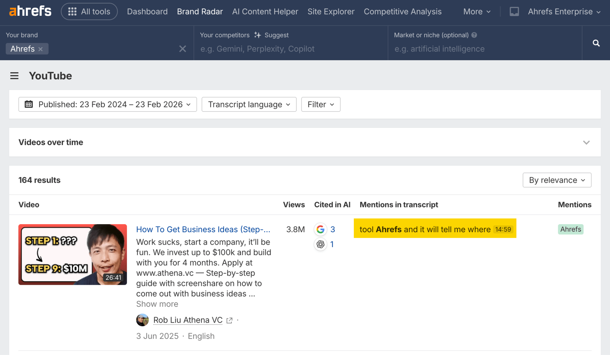 You can already start monitoring multi-platform brand mentions in Ahrefs’ Brand Radar, which aggregates indexes from YouTube, TikTok, and Reddit.