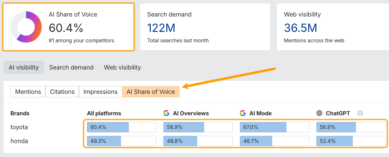 Measure your AI Share of Voice compared to competitors: Benchmark your presence against rivals in AI search.