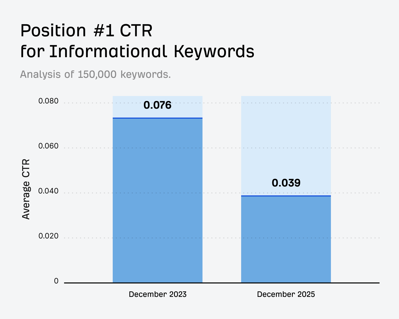 In December 2023, the average position one CTR for informational keywords was 0.076. In December 2025, this had dropped to 0.039: