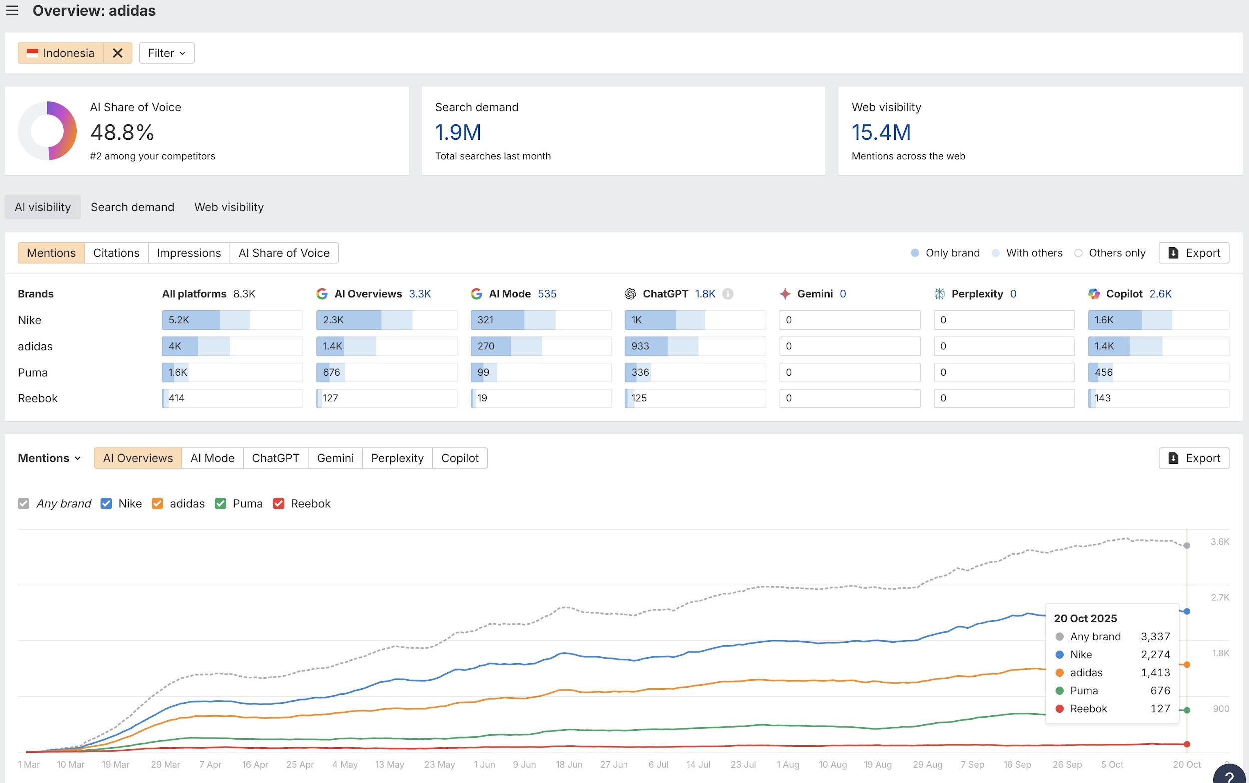 Enter your brand, go to overview or AI responses, select AI Overviews or other chatbots, and you’ll see the queries your brand appears for. You can also track your competitors across different regions.